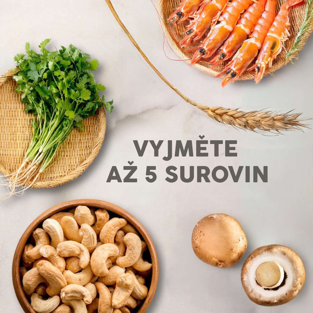 Máte potravinovou intoleranci nebo nemáte rádi některé potraviny? U nás můžete vyjmout až 5 surovin, které Vám nevyhovují, a to zcela zdarma. Dopřejte si jídlo přesně podle Vašich představ.